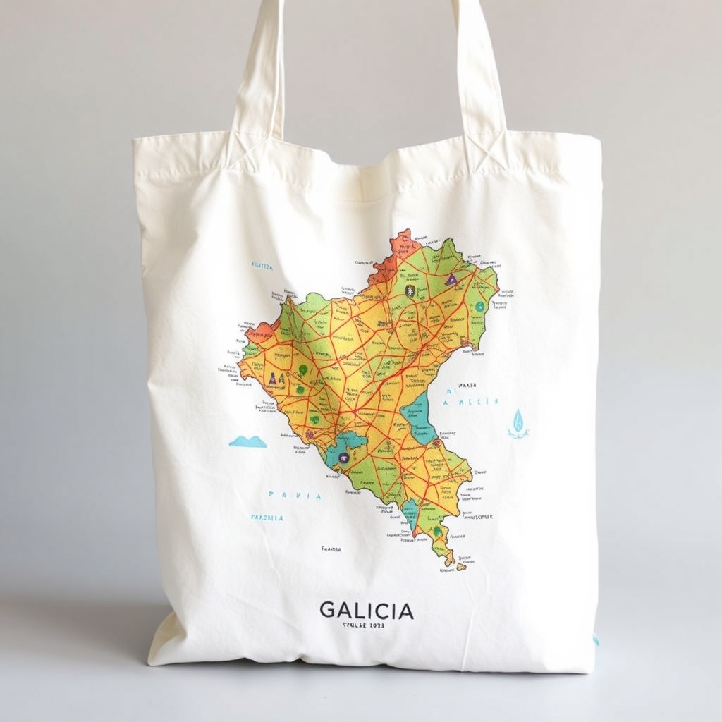 Bolsa tote de algodón orgánico 100% con estampado «Galicia Mola» y mapa artístico de las 4 provincias. Perfecta para compras, playa o uso diario. Dimensiones: 38x42cm, asas largas.